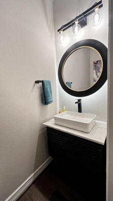 [This review was collected as part of a promotion.] Got the designers fountian revella 3 light bath for my guest bathroom we are renovating to make more open and better lighting. I love the sleek black design. Picked one with the gold but ours came all black and glad it did. And the lightbulbs without a cover really let the light shine like I was hoping! This seriously looks amazing! infact we plan to buy 2 more and place in my master bath!