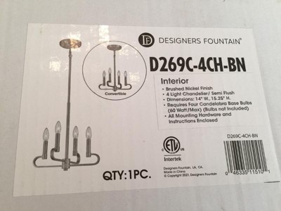 Designers Fountain�s Summit collection combines Modern simplicity and the elegance of candelabra-style curves and bare bulbs. Summit is available in timeless Brushed Nickel or sleek Matte Black. Made from durable steel for years of enjoyment and illumination. Timeless Brushed Nickel finish works well with nearly any d�cor Max hanging height of 48.25 inches with included rods Chandelier converts to a Semi-Flush Mount for flexible placement Uses 4 candelabra-base 60W max bulbs (not included) Bare bulb design eliminates the shade and maximuzies illumination Rated for Dry indoor areas only Transitional chandelier is great for living rooms, foyers, and large rooms/areas of your home.,