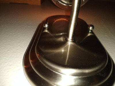 [This review was collected as part of a promotion.] The brushed Nickel is shiny and clean. The glass shade is very thick and strong with a little abstract detail in the glass. It's easy to install and looks elegant. I highly recommend it, especially for hallways. I bypassed electric hook up by using an emergency light bulb that is rechargable. That allowed me to put it anywhere I wanted. One of the screws was too long for the bolt end to screw down all the way. Otherwise it's perfect.
