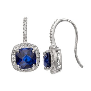 Elegant and timeless, these drop earrings by Designs By Gioelli make a captivating statement. Featuring cushion-cut created sapphires in a deep royal blue, each stone is framed by a shimmering halo of created white sapphire accents. The polished sterling silver setting and delicate French wire hooks add a graceful finishing touch.