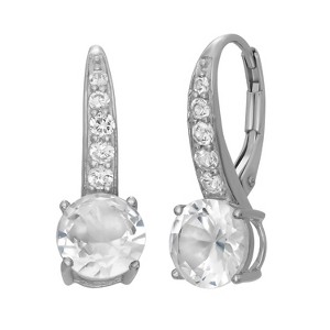 Sparkle with timeless grace in these sterling silver drop earrings by Designs By Gioelli. Each earring showcases a brilliant round-cut center gemstone, encircled by a shimmering halo of smaller white sapphire stones for maximum radiance. The leverback closure is accented with pave-set stones, adding an extra touch of luxury and secure comfort.
