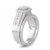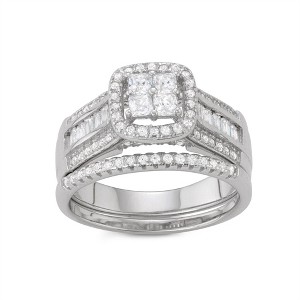 Elegant and timeless, this Designs By Gioelli ring set dazzles with refined brilliance. The centerpiece features a square cluster of created white sapphires, bordered by a sparkling halo and complemented by a cascade of baguette and round-cut stones along the band. Paired with a sleek coordinating band, this sterling silver set captures sophistication and modern charm in every detail.