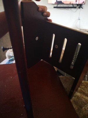 This table is cute and just the height we needed. Putting together was not so hard, but after we stood it up and it kept leaning. This did not come with wood glue, although it is required to build this. Had to run out and get some and also glue the middle section (paper holder) to the main board up the middle to stop it from leaning. Some pieces did have chunks out of edges, but mostly on areas that won't be seen the way I am setting it next to a chair. Wouldn't be worth returning. For the price - ok.