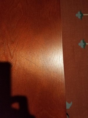 This table was exactly what I was looking for - good price, small size, solid construction, easy assembly and good color for the furniture I needed to match. What I didn't count on was a long, black mark that almost looks like a scratch in the middle of the top, under the finish. It looks like it happened in production and they tried to rub it out or cover it up. I'm disappointed, but then again, not totally surprised - you always get what you pay for one way or another.