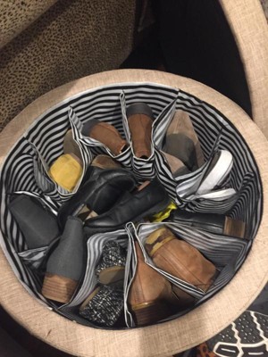 A: Hi Tom, The round shoe storage ottoman holds 12 pairs of shoes. If you have any other questions you can always reach out to us directly at info@conveniencefurniture.com. Sincerely, Katrina Vega Convenience Concepts Inc.