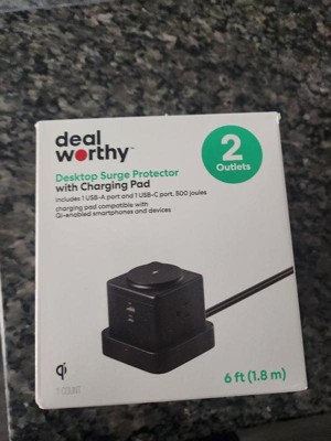 The Desktop Surge Protector USB-A and USB-C with Top Charging Pad Black from dealworthy™ offers two grounded AC power outlets and a top charging pad, providing versatile charging options. It features USB-A and USB-C ports, making it compatible with a wide range of devices. With a 500-joule rating, it ensures protection against power surges with LED warning lights that provide clear status updates.