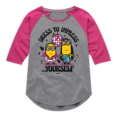 Despicable Me Minions - Dress To Impress Yourself - Toddler & Youth Girls Raglan Graphic T-Shirt - Celebrate the essence of Universal's Despicable Me Franchise with officially licensed apparel featuring unique designs crafted exclusively by Hybrid Apparel. Each piece brings beloved characters, iconic imagery, and memorable moments to life, offering Despicable Me Franchise fans a one-of-a-kind way to showcase their passion.