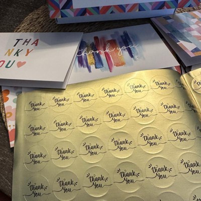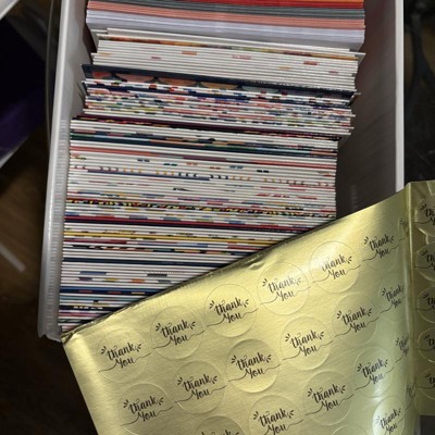Crafted from thick card stock, these thankful cards look and feel sturdy. Our set of thank you cards comes with 100 cards, 100 colorful envelopes, and gold seals. Store everything in the sturdy storage box.