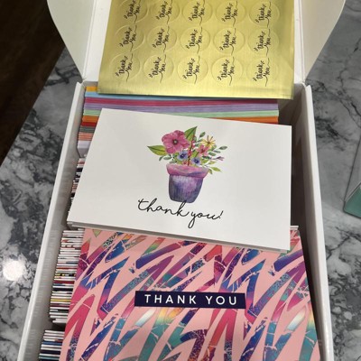 [This review was collected as part of a promotion.] I LOVE this set of Thank You cards!! This is so well done and well thought out. The Thank You cards themselves are really cute and fun! There are 100 to choose from, so you’re sure to find the right style and design for whoever you’re sending it to. Many of them have flowers or pinks, but there are plenty with bold colors and designs that my husband can use too. I really love how they’re arranged in the box, it’s definitely a huge feature when buying this and very useful. The cards are stacked at the front and the envelopes at the back with many different colored envelopes to choose from. You also get the set of “Thank you” stickers which fits right on top of the box when you’re done. All of the cards are blank inside. The backs even have a continuation of the design - these are just adorable! This set should last me years to come and it’s all self contained and ready to go. I can’t recommend enough! I received an incentive to write this review.