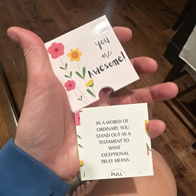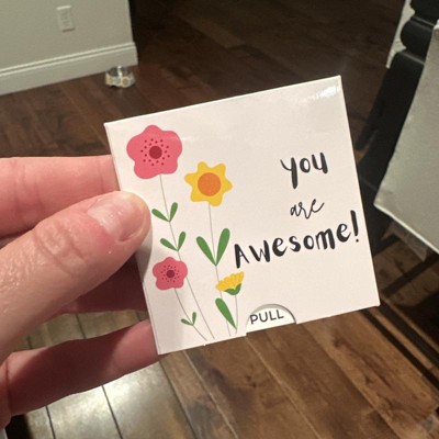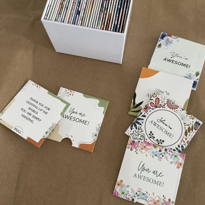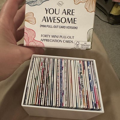 [This review was collected as part of a promotion.] These little “you are awesome” pull out cards are adorable, and the opportunities for use are many! They came packaged super well in a box and protected with packing paper. The box that stores the cards is very well made, sturdy and easily opened. The cards themselves are a very high quality shiny cardstock. The pull out card is blank on one side for your message then the other side has positive affirmations that are different on each card. I envision using these for lunchbox notes, encouragement for employees or coworkers, name card for gifts, etc. The price is reasonable for the quantity and quality! I received an incentive to write this review.