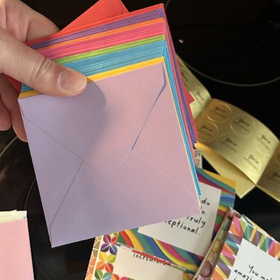 [This review was collected as part of a promotion.] These are great and an awesome way to show appreciation and support for someone. The cards are a nice size for a decent sized note and made of a sturdy but lightweight and thin material. The envelopes come in a variety of colors and the gold envelope sealing stickers are just the icing on the cake. These would be a sweet way to celebrate teachers and staff at the end of the school or to just have on hand. I received an incentive to write this review.