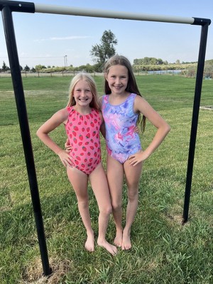 The Strawberry Fields Leotard by Destira is a vibrant pink and red gymnastics leotard featuring an open-back design and a charming strawberry print. Crafted from durable, high-quality, 4-way stretch fabric, it offers lightweight breathability and superior flexibility, ensuring comfort during workouts. The split-back styling is particularly suitable for athletes with longer torsos. A matching scrunchie is included to complete the look.