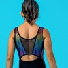 Shine bright in the Tokyo Nights gymnastics leotard. Designed with rainbow foil fabric for a dazzling look, this leotard features a split-back design with a black mesh inset for breathable comfort. A sleek black bottom balances the bold shine, making it perfect for practice, performance, or even a living room dance party.