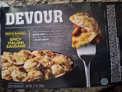 - DEVOUR Pesto Ravioli with Spicy Sausage is made with quality spicy sausage