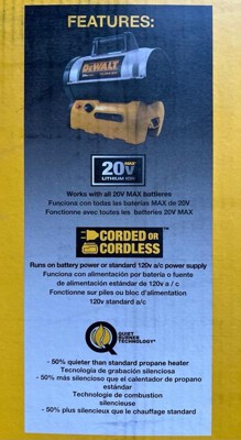[This review was collected as part of a promotion.] This Dewalt cord/cordless propane heater is compact and portable, which makes it easy to use it in remote areas where you are without electricity with the battery pack option. Variable control allows you to adjust the amount of heat output to be between 27,000 and 68,000 BTU'S to keep the area you're working in very comfortable. Battery life is very good, keeps burning for hours. Built-in safety features make it worry free. Looks to be very durable and should last for years.