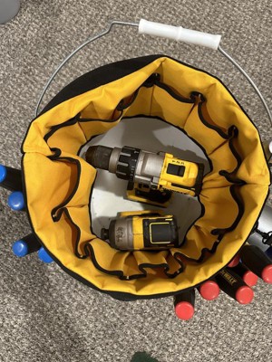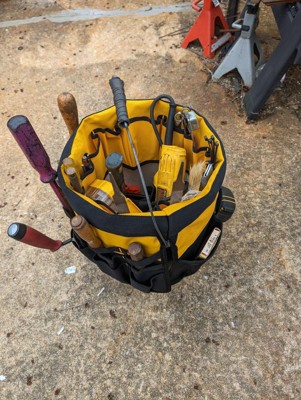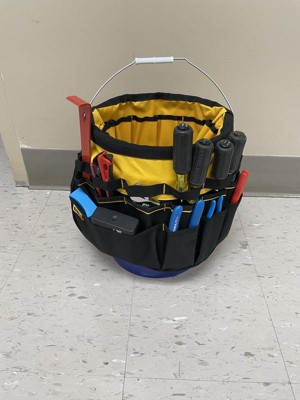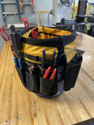 [This review was collected as part of a promotion.] Great little organizer if if you need a little more organization then just a plain bucket. This is a classic and simple design a lot of pockets on the inside and outside to hold everything from pliers tape measure electrical tape. Variety of pocket sizes for different tools. Fabric feels durable and very thick and tough The rim is reinforced with webbing