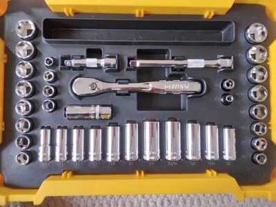 [This review was collected as part of a promotion.] The Dewalt DWMT 45400 Ratchet and socket set is a tool set that is made by people who use and know tools.At first glance the packaging is impressive. The tool set comes in a slim shallow tool tray unmistakably in the bold yellow and black Dewalt color, that is connectable with other Dewalt tray systems. The tool set comes standard with a 37 pieces - (2) 3/8" drive extension bars 3" & 6", (1) 3/8" drive Spark plug socket, (10