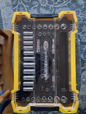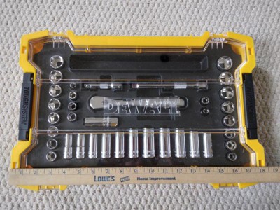 [This review was collected as part of a promotion.] The Dewalt 37 piece socket set looks good in the ToughSystem tray. The case is meant to be used alone or within the ToughSystem. I have had the set for a few weeks and have performed several tasks around the house including the repair of wooden chairs. The high quality of this set is evident by the weight of each piece. The set is chrome finished and Dewalt added knurling to the sockets and extensions. The set offers both metric and standard size sockets. A three inch and a six inch extension is included with this set. The is a small compartment that hold miscellaneous parts. The sockets can be easily found and are positively held in place by the sleek plastic case. The fit and finish of this set is on par with higher priced sets. The ratchet feels good in the hand and is well balanced. The quick switch on the handle is very convenient for switching between tightening and loosening. The weight of each piece speaks of the heavy duty construction. Each socket is etched with the size and is easily readable. The knurling helps in giving a better grip on the pieces. This socket set is for the professional or the homeowner. The 72 tooth ratchet allows progress to be made in tight spaces where room is lacking. The sockets are six point and are well constructed. If this system had a handle incorporated in the case, this set would be unbeatable. I highly recommend this socket set.