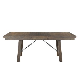 The Picket House Furnishings Dex Dining Set makes rustic entertaining easy. Its smokey walnut finish and earthy wood grain detail create an organic look. Flared legs, turnbuckle accents, and upholstery chairs add a contemporary flavor to this charming set. Make room for more family and friends with its 18" leaf, extending this table to 78" long.