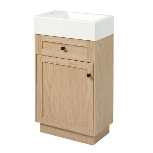 Upgrade your bathroom with this 18.5" Rustic style vanity featuring a veneer of Wood Grain Triamine and easy-to-clean resin sink. Thoughtfully designed with an adjustable shelf, it offers smart storage for daily essentials without taking up extra space. The clean lines and quiet soft-close doors add a touch of elegance and calm to your routine. Perfect for small bathrooms seeking both beauty and function.