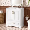 Upgrade your bathroom with this 30" modern vanity featuring a clean white finish and an easy-to-clean ceramic sink. It includes a drawer with built-in dividers and two soft-close doors with dual interior storage racks, offering smart and organized storage for your daily essentials. The soft-close doors and streamlined design add a quiet, refined touch to your daily routine.