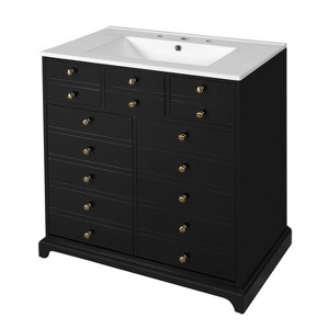 - [ Multi-Purpose Cabinet & Concealed Storage ] Are you looking for stylish and functional storage solutions for your bathroom? Our bathroom vanity provide ample space for all your toiletries and bathroom essentials. The combination of the cabinet body and the drawer perfectly stores all kinds of bathroom products and keeps the necessities away from water stains and dust. Soft-close doors and drawer fronts feature a water-resistant paint finish for durability.