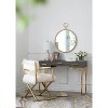 Showcasing a simple, sleek circle silhouette and a gorgeous gold frame, this decorative accent mirror is certain to elevate the decor in your living room, entryway, powder room, or office. Crafted from solid iron, the frame is afforded long-lasting durability, providing the high-quality glass with reliable protection. To complete the benefits, Measurements: 22W x 28H x 2D.