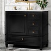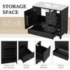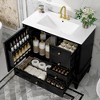 Elevate your bathroom with this 36-inch freestanding vanity, designed to offer both sophisticated style and everyday functionality. The cabinet features a black painted finish over a sturdy MDF structure, reinforced with a solid poplar wood frame and rubberwood legs for enhanced stability. The spacious ceramic sink top comes pre-drilled with 4-inch centerset faucet holes for easy installation (faucet not included).