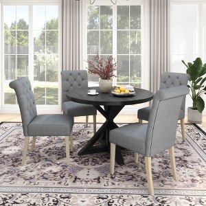 This set includes a sleek dining table and four Parsons dining chairs, effortlessly combining style and comfort. Crafted with durability in mind, the round dining table with a cross-buck pedestal base finished in a rich black with beautiful wood grain texture is sure to impress your guests. The table top made of oak veneers and engineered wood, and the table base made of solid rubberwood, ensure long-lasting durability. The infusion of wood veneers adds dramatic, modern farmhouse character to the design. The chairs are designed with padded seats and backs, providing optimal comfort for your dining experience. The button-tufted detailing on the chairs adds an extra layer of elegance.