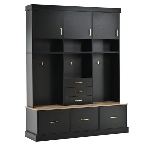This sleek, multifunctional hall tree is the perfect blend of style and practicality for your entryway, hallway, or living space. Featuring three cabinets, three open shelves, and six drawers, it offers ample storage to keep your home organized. The large seat with a wood-grain finish adds a touch of elegance while providing comfort for putting on shoes or resting. With three metal hooks and durable handles, this piece helps you keep your everyday items within easy reach. Crafted from high-quality MDF, this hall tree is built for long-lasting use. Its modern design is complemented by anti-tip hardware for added safety, making it an ideal choice for homes with children or pets.