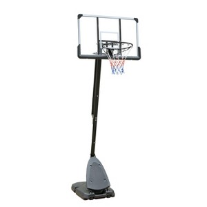- Overall Dimensions: Backboard size 28 x 18" ( L x W ),Adjustable Height 5.6ft - 7ft, Base size 29'' x 22'' x 5.5" ( L x W x H ),Rim diameter: 17". Assemble needed.
