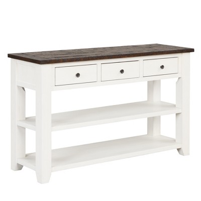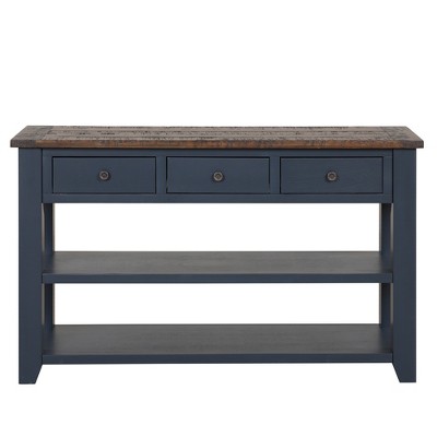 The top of each console table is deliberately aged with a lot of labor and effort, which forms a strong color contrast with the solid color table body,creating a visual collision. and bring retro glamour to your modern and stylish living room. The top is equipped with three same-sized drawers, which can be used to store your daily essentials. Two tiers of shelves provide the perfect place for your shopping baskets, decorations and more.