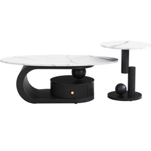 - 1. Elegant and Unique Design: Contemporary style adopts an authentic touch with the faux marble, plastic drawer and black metal frame Coffee Table and end table set. The mix of three materials ensures an extremely elegant look and will allow it to be installed in any style of interior.