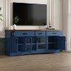 This TV Stand, crafted from durable manufactured wood, measures 67"W * 15.5"D * 29.25"H. Its attractive blue color paired with a walnut top suits most home styles. The 4-door (with two middle glass doors) and 3-drawer structure, plus 3 storage spaces with adjustable shelves (in 3 height options), offers versatile storage. You can organize media devices, books, and small items neatly. Assembly is required, but clear steps help. It’s a perfect blend of style and functionality for your living room.