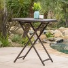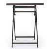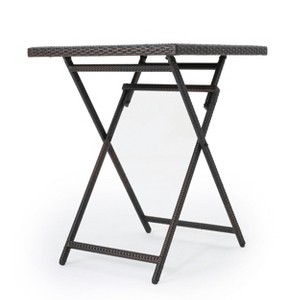 This folding, outdoor bar table is a great addition for any patio. Made with powder-coated iron for a sturdy frame and wrapped in top quality wicker, this table is a great addition for any backyard. Use this table for family dinners outside or as extra table space at events for extra cups and plates for your guests. The uses of this folding wicker table are endless. Discover your use today!