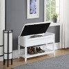Perfect in the entryway, this Rouen Clea white Seating Bench with Shoe Storage provides a practical place to sit and is loaded with smart storage. Sit on the cushioned seats of this bench or lift to reveal open storage inside. A handy open shelf below is perfect for storing shoes, boxes, and more. The bench is constructed of a clea white wood frame and slatted shoe shelf with white PU leather upholstery and a padded seat cushion. This storage bench has a transitional design that works with any decor and is available in finish options.