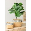 Use this set of 2 rectangular basket planters with geometric trim details to bring a rustic, ethnic touch to decor, indoors or out. The delicate black and white details of the trim set off the natural tone of the body. The rectangular proportions of these planters mean that at least two smaller plantings can go in each.
