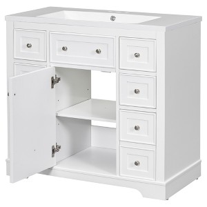 - Vanity with Cabinet & Drawers & Shelf - Considering the humid environment in bathroom, this bathroom vanity has ample enclosed storage spaces: one cabinet with door, three drawers with slide rail each side (the top middle one drawer is for decoration use only), and adjustable shelf in the cabinet. You can put soaps, towels, shampoos, tissue paper and other bathroom essentials in it so to keep them away from dust.