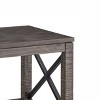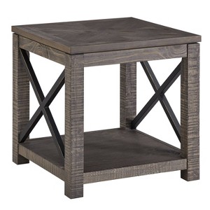The Dexter end table features rustic styling with beautiful rough-hewn posts. This mixed media end table has a metal X motif on the sides for additional styling. The square top end table features a bottom shelf for additional storage and display. The distressing on the finish and the rasped edges create a vintage look. Your purchase includes one end table.