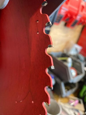10 cuts of 3” diameter 16 gauge 304 stainless and 25% of the carbides are broken. and this was going nice and easy with a low rpm skil metal saw. this blade does not last with stainless! cuts nice and clean otherwise.