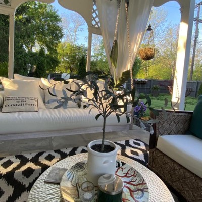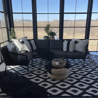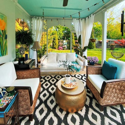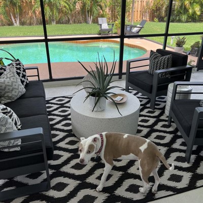 This Target rug could not be more perfect in my ‘outdoor room’. The black and cream colors are beautiful and any dirt just washes right off with a quick spray from my hose. I can’t say enough great things about this rug!!