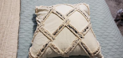 Tickle your senses with the eyelash fringe and black embroidered stitching on the diamond pattern featured on this Rizzy Home Neutral Ivory and Black Square Geometric Throw Pillow. This piece is a great textural addition to your pillow collection. A solid ivory, 100-percent cotton back with a hidden zipper and knife edge, completes the look and allows for easy access to the pillow's polyester fill.