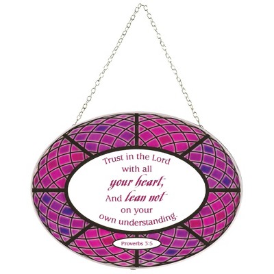 Enjoy the sunlight that filters through this oval suncatcher; Features sentiment " I can do all things through Christ" from Philippians 4:13. Made of a quality glass material with metal chain; Comes with an attached chain hanging loop for easy display. Measures approximately 6 x 9 inches; Includes suction cup for easy display on a window. Perfect for decorative display hanging in the window of your home or office space. Contained in protective packaging; Ready for easy gifting for a birthday, holiday, Christmas, Mother's Day or other celebration