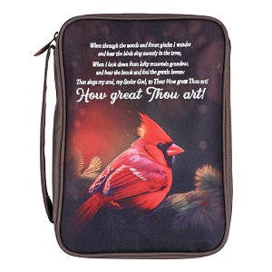This Brown Fabric Bible Cover Is A Sturdy 600 Denier Canvas-Look Polyester With Nylon Reinforced Stitching. Non-Rusting And Self-Repairing Side Zipper With A Cross Zipper Pull. Carrying Handle At Side. Cover Lays Completely Flat When Open; Inside Is A Loop For Your Pen And An Attached Ribbon Bookmark. The Large Print Size Holds A Bible Or Book Up To About 7-3/4 X 2-1/2 X 11-1/4. The Front Cover Displays A Sublimated Winter Cardinal With Embroidered Words From The Popular Song How Great Thou Art: When Through The Woods And Forest Glades I Wander And Hear The Birds Sing Sweetly In The Trees, When I Look Down From Lofty Mountain Grandeur, And Hear The Brook And Feel The Gentle Breeze: Then Sings My Soul, My Savior God, To Thee: How Great Thou Art! How Great Thou Art! Comes Packaged In A Poly Bag.