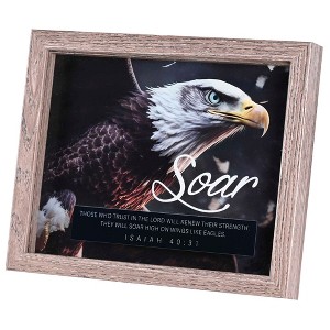 Shadow box style framed decor features an eagle with "Isaiah 40:31 Those who trust in the Lord will renew their strength, they will soar high on wings like eagles"; Woodgrain frame is made of MDF wood; Black boxed scripture is printed on the underside of glass that sits 3/4 inch above the art print; Print and glass measure 10 x 8 inches; Outer frame measures 11 x 9 inches; Removable back includes pull-out easel plus hanging hooks for either tabletop or wall display; Hang in your living room, bedroom, or office, and let the timeless words inspire and uplift you each day; Share the gift of faith and love with friends and family by gifting them this beautifully framed print; Contained in protective packaging; Ready for easy gifting