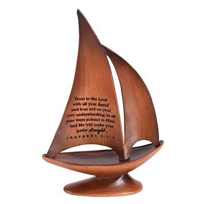 This beautiful sailboat statue is a gentle reminder of the hope of heaven; Sentiment reads "I can do all things through Christ who strengthens me. Philippians 4:13", Made of resin; Design features a smooth sailboat with a wood-style look, Figurine statue measures approximately 8.5 x 5.2 inches; Looks great on a table, shelf, mantel, or counter, Perfect for gifting to yourself or someone else; Figurine looks great on a shelf, bookcase, coffee table, or counter, Contained in protective packaging; Ready for easy gifting for Christmas, a birthday, an anniversary, or any special occasion!