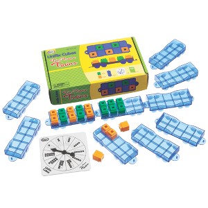 Didax Ten-Frame Trains Activity Set | Students develop a concrete understanding of the concept of ten and patterning with these connecting train cars, each holding 10 Unifix Cubes. By filling the spaces and connecting the cars, children can see and feel "10 and some more," 20, 30, etc. These trains are also very good for use with Singapore Math activities. Includes ten cars, ten-frame spinner, 20 Unifix Cubes, and teacher's guide with games, teaching ideas, and assessment instructions. For individual or small group use.