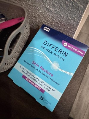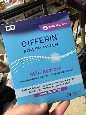 Target white head pimples with Differin Power Patch Skin Restore Pimple Patches. Featuring a 4-in-1 Hydrotech(TM) formula, these hydrocolloid patches absorb and restore the skin by extracting impurities and conditioning the area for smoother, healthier looking skin. With zinc hyaluronate to help retain moisture and niacinamide to help improve skin tone and texture and reduce the look of redness. Salicylic acid gently exfoliates while the hydrocolloid layer creates a barrier to help promote clearer skin. These clinically tested patches are safe for all skin types, including acne-prone and sensitive skin. Each box comes with 23 clear patches in two different sizes (15 small and 8 large) for discreet, versatile blemish coverage for zits, white heads, blackheads and more. After cleaning and drying the area, place patch on a pimple. Leave each acne patch on for a minimum of 8 hours or overnight, remove and discard. Reapply a new pimple patch, as necessary.