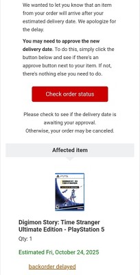 Shouldn’t have ordered from target preorder and now they want me to approve a additional delay. Release date was October 2 and from what I read it was going to arrive by the 6-10 not a month after release date absolutely ridiculous. Horrible experience