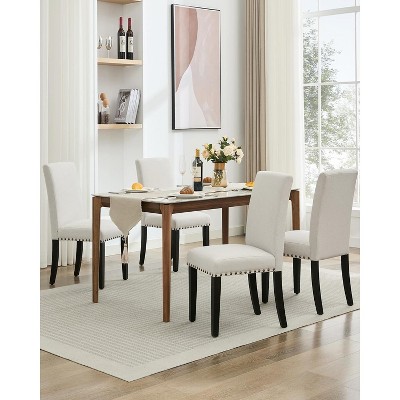 Dining Chairs Set of 6,Modern Fabric Upholstered Ergonomic Chairs with Curved Backrest, Heavy-Duty Wood Legs for Kitchen, Off-white, Rivets